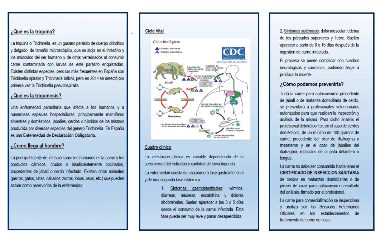 Con estas inspecciones, y con la divulgación de este tríptico, el Gobierno regional a través de su Consejería de Sanidad, busca ofrecer la mayor garantía en la seguridad alimentaria de los productos que consume la ciudadanía castellano manchega, previniendo la triquinosis y otras zoonosis que se pueden transmitir a través del consumo de carne y consiguiendo los mayores niveles de protección de su salud.